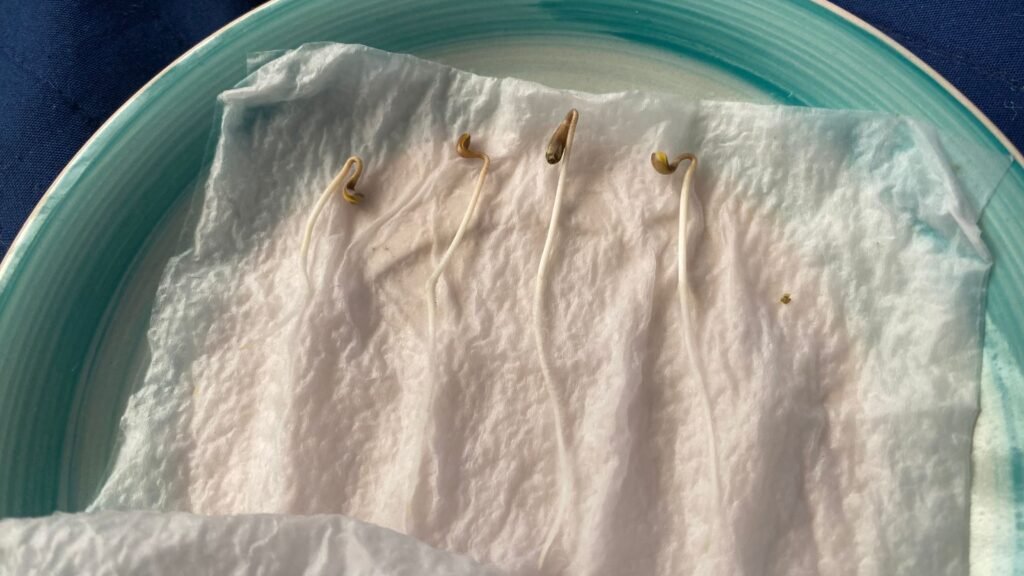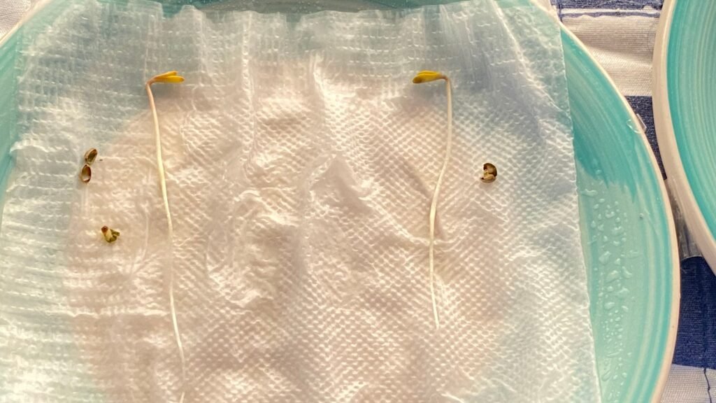 el paso 1 es poner la servilleta 1 en el plato, rosiarla con agua hasta que quede bien humeda pero no empapada de agua, luego pon las semillas y tapalas con la segunda servilleta rosialas con agua otra vez y tapalas con el segundo plato.