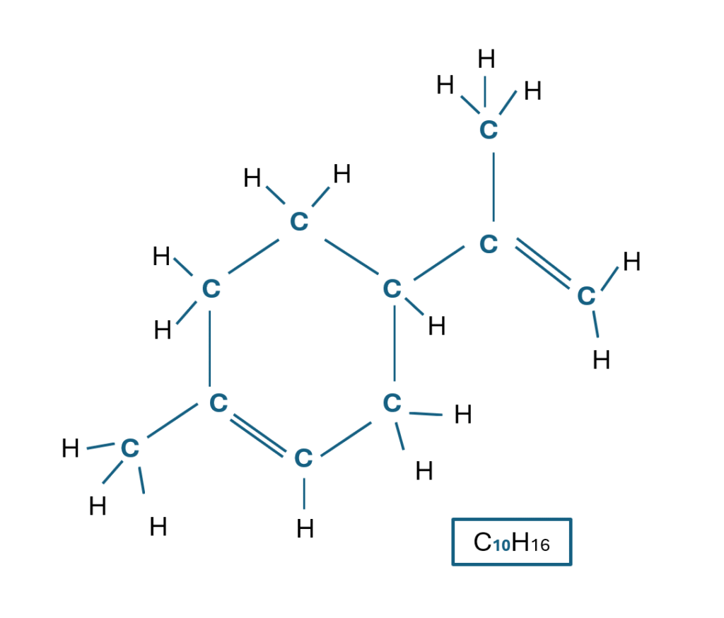El Limoneno, al ser un monoterpeno cíclico, tiene un anillo de Carbono de seis miembros, dos enlaces dobles carbono-carbono y un grupo isopropilo unido al anillo de carbono. Todas estas características dan lugar a la fórmula química C10H16.