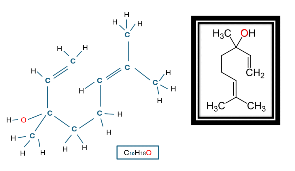 Desde el punto de vista químico, los terpenos están formados por pequeños bloques llamados unidades de isopreno, que son unas estructuras que contienen cinco átomos de carbono, ocho átomos de hidrógeno y dos enlaces dobles. El Linalool es un monoterpeno (formado únicamente por dos unidades de isopreno), por lo que su fórmula molecular es C10H18O; esto lo sitúa en la categoría de terpenos más pequeños estructuralmente y hace que sea muy volátil.