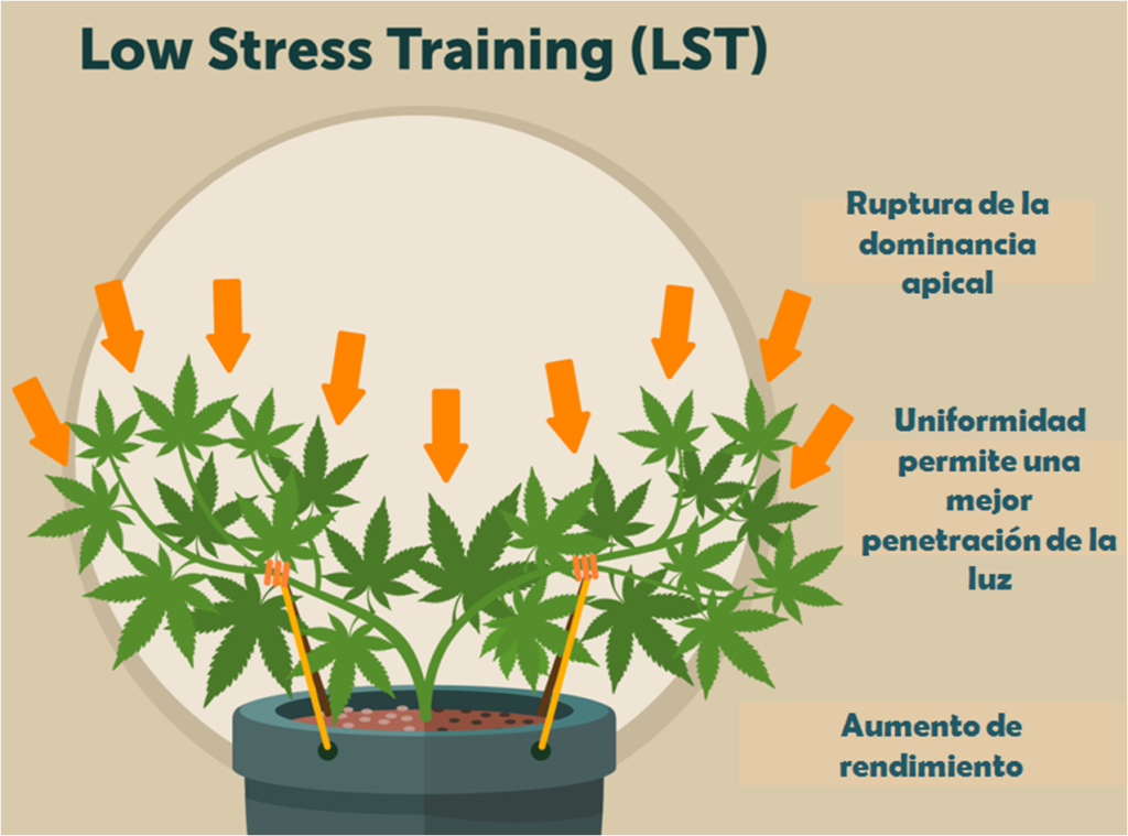 La técnica LST consiste en doblar la punta o tallo principal de la planta y atarla con la intención de que crezca y permanezca de forma horizontal y a la misma altura que las ramas secundarias. Esto favorece un crecimiento y desarrollo de todas  las ramas por igual y una recepción de la luz más uniforme, a la vez, permite mantener el control de la altura.