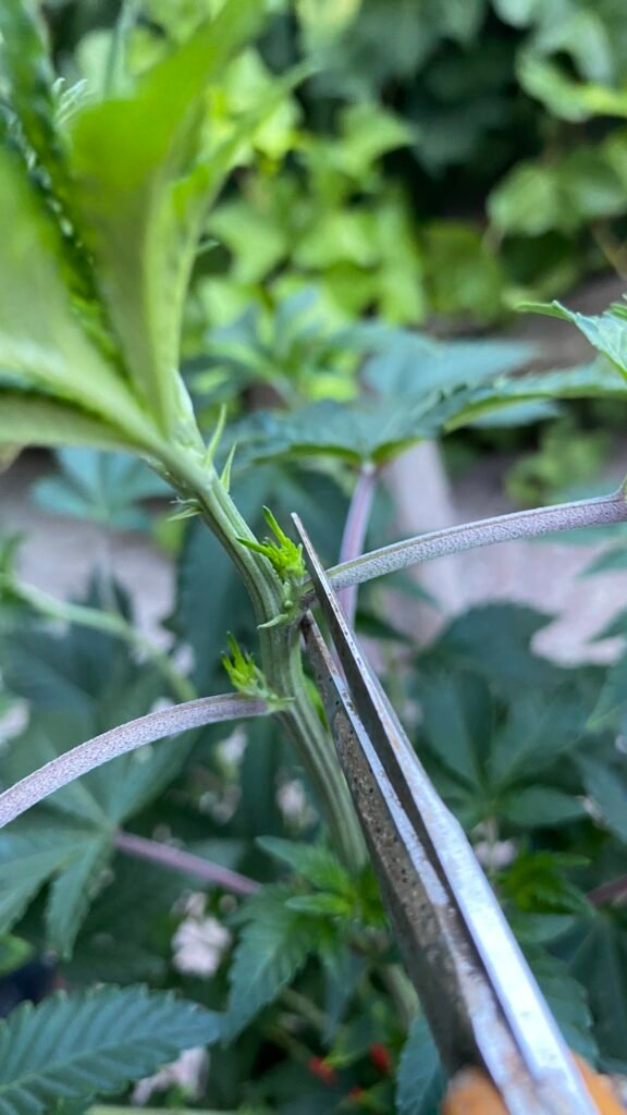 At this point, you should cut the apex starting at the third node from the bottom. Then, remove everything below this node to focus your energy on the chosen points. After this, tie the branches to the pot or the central stem to ensure horizontal growth; the final appearance of the plant resembles the letter «Y». If the branches are still too small to tie, you should let them grow a little. Each time you make a topping cut, the number of main buds doubles.