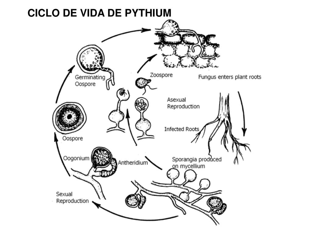 El Pythium ataca los tejidos juveniles, como la punta de la raíz y las plántulas recién germinadas. Después de entrar en la raíz, el hongo puede causar una rápida podredumbre de color marrón a negro de toda la raíz primaria e incluso puede ascender hasta el tejido del tallo.
