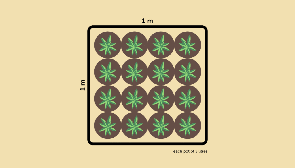 It’s a good idea to keep in mind several factors before planting x number of plants and the pots used for them. The more plants grown per square meter, the smaller the pot size will be. In a space of 1 m2, a maximum of 25 plants can be planted in 7 L pots (20 x 20 cm), thus occupying 100% of the space. If you want to plant more plants in the same space, you’ll need to reduce the size of the pot. You can plant 49 plants in a 7 x 7 format in 3 L pots, giving you an average of 10 g per plant, giving you a yield of 490 g per square meter.